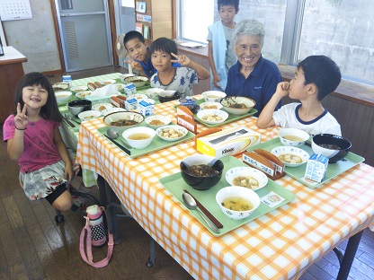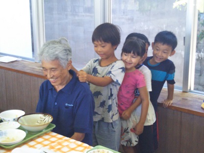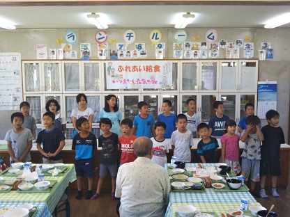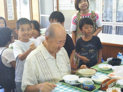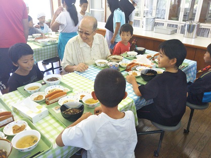 給食時間には、おじいさん・おばあさんをご招待して「ふれあい給食会」を行いました。今回は、2名の方がご参加くださいました。