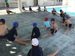 みんなで準備体操をしっかり行い、低学年(1・2年生)と中高学年(3~6年生)のグループに分かれて学習を行いました。