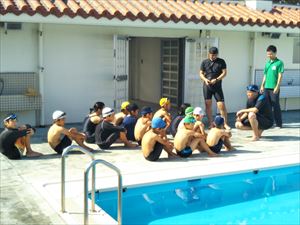 出発前から子ども達はワクワク・ウキウキ。まず、川平小中学校の山城校長先生へご挨拶をしてから早速プールへ。