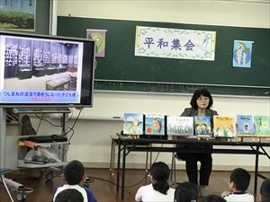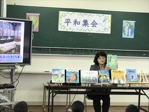 今日は、平和月間オープニング集会で絵理子先生から「平和月間の取組」についてのお話と校長先生のお話(本の紹介など)がありました。