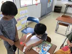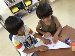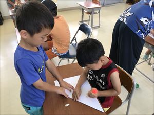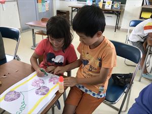 2年生のお兄さんから、あさがおの花はどんなのを選んだ方が良いかや、たたき染めの仕方まで、優しく教えてもらいました。