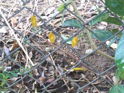 金色に輝くサナギがスズナリにぶら下がっていいます。幼虫は自分の好きなところを選んでサナギになるので、針金に