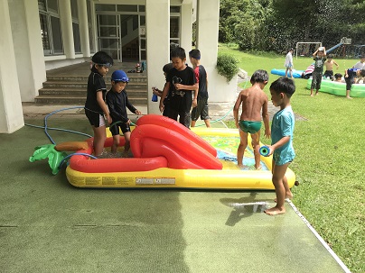 集中する場面もあり、先生方も子ども達と一緒に暑い夏の気持ち良い水遊びを楽しみました。