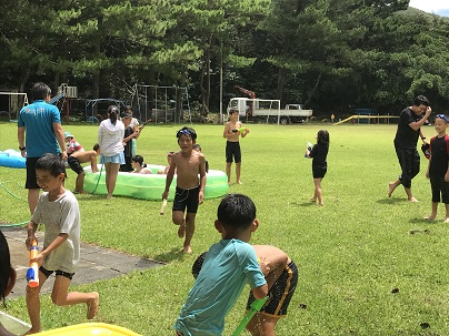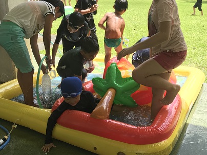 つかったりしながらそれぞれに水遊びを楽しんでいました。子ども達の水かけは、悠平先生や裕次郎先生に