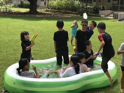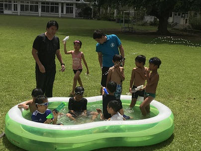 皆で「水遊び」を楽しみました。子ども達は持参してきたペットボトルや水鉄砲で水をかけ合ったり、水の中に
