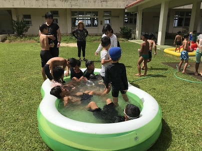 全児童で1学期の”お楽しみ会”を行いました。保護者のご協力もいただき、家庭用のプールを3つ準備して